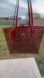Elegant Coach tote featuring signature pattern. Rich brown with striking red hearts. Ideal for daily wear.