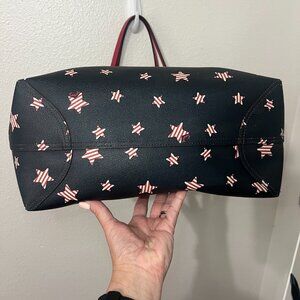 Stylish Coach tote with star pattern. Features red handles and trim. Perfect for everyday use.