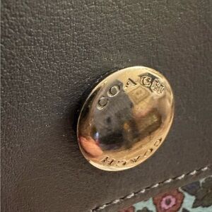 This bag is reversible. The body is done in coated canvas with a floral design in lt. blue, navy, green and dark red. The reversible flap is done in leather and goes from a midnight blue to ivory, with snap closures. The flap has a magnetic snap closure. The inside is fabric lined with a zip pocket and a multifunction pocket. There is a removable cross body strap which is 21 1/2". The bag is 9" x 5 1/4" x 2 3/4". Brand new without tags !