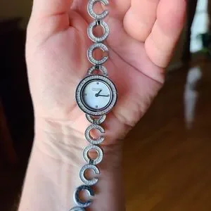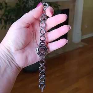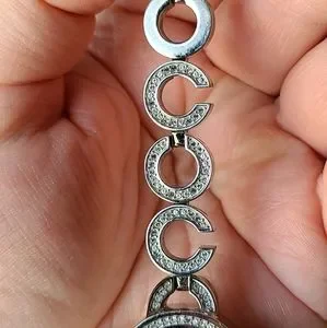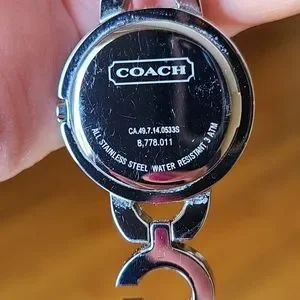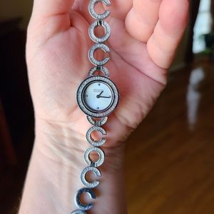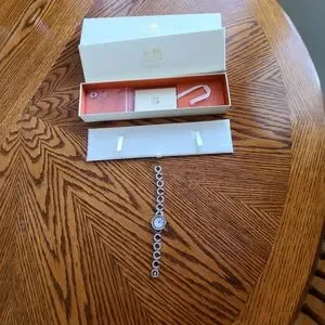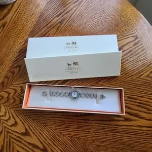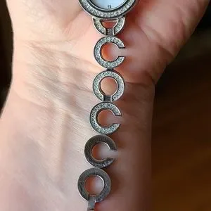 Ladies Coach Watch with rhinestones circling the face of the Watch and along the length. This was a Christmas gift from my husband a few years ago but I just don't wear watches anymore. Been sitting in my jewelry box. It needs a new battery since it has been about 5 years since I have worn it. Comes with original box and extra length to make it longer if needed. Excellent condition, and smoke free home. All Coach Watch movements are crafted by Movado.