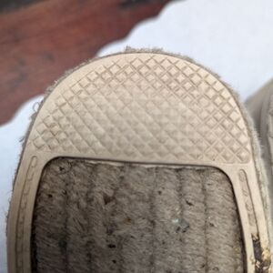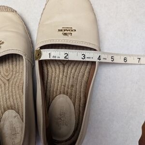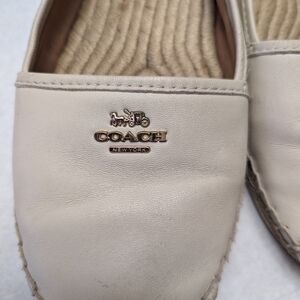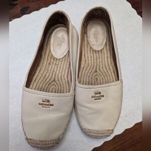 Authentic Coach Rhodelle off white slip on shoe. Decent pre-loved condition - please see photos. All Flaws pictures. Flaws noted: wear on heels and minor scuffing, wear on soles. Could definitely use a good cleaning and possibly reshaping. Really cute leather shoes with beach vibe soles perfect for spring & summer. Women's 8.5 - Additional measurements in photos. Pricing does reflect condition, but offers are welcome. Fast shipping, happy to bundle.