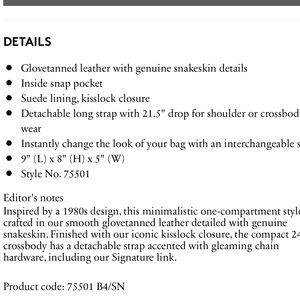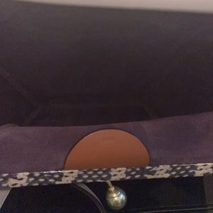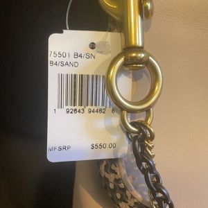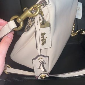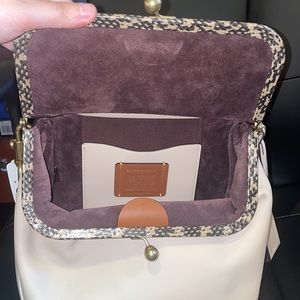 This is a NWT Coach Rider 24 in the color Sand. It features brass hardware and snakeskin trim. The interior is a purple suede. This bag was apart of the 1941 collection. The crossbody strap is adjustable and removable. There is no inside snap pocket (only the outside is a kiss lock). Please look closely at the pictures for any minor indents. I am a 5 star seller! I will securely package your bag and will record the process to prevent scammers💗
