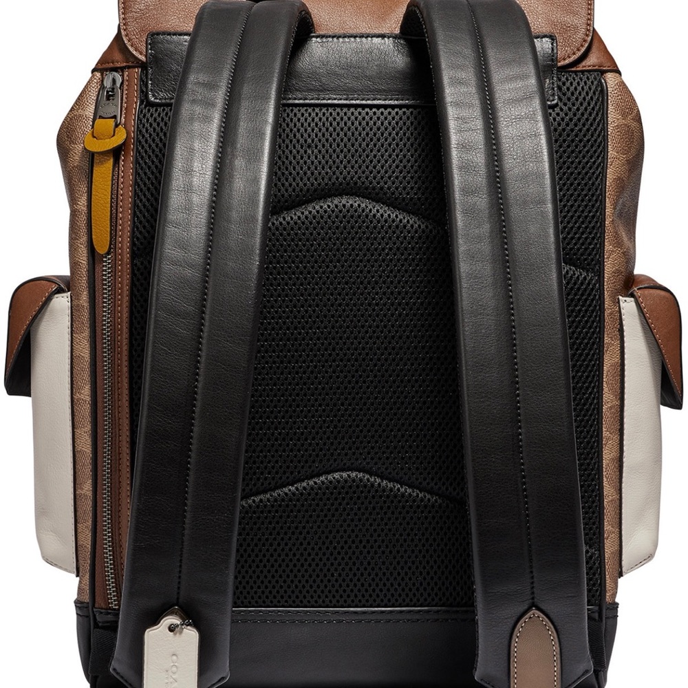 Coach Rivington Backpack in signature coated canvas and smooth leather featuring a drawstring and speedclip closures, a fabric lining, adjustable shoulder straps, top habdle with 3 1/2", exterior snap pockets, interior sleeve with secure tab for a 15" laptop, interior zip; cell phone and multifunction pockets and a exterior zip access to interior. Dimensions: L" 10 3/4 x H" 15 3/4 x W" 6.