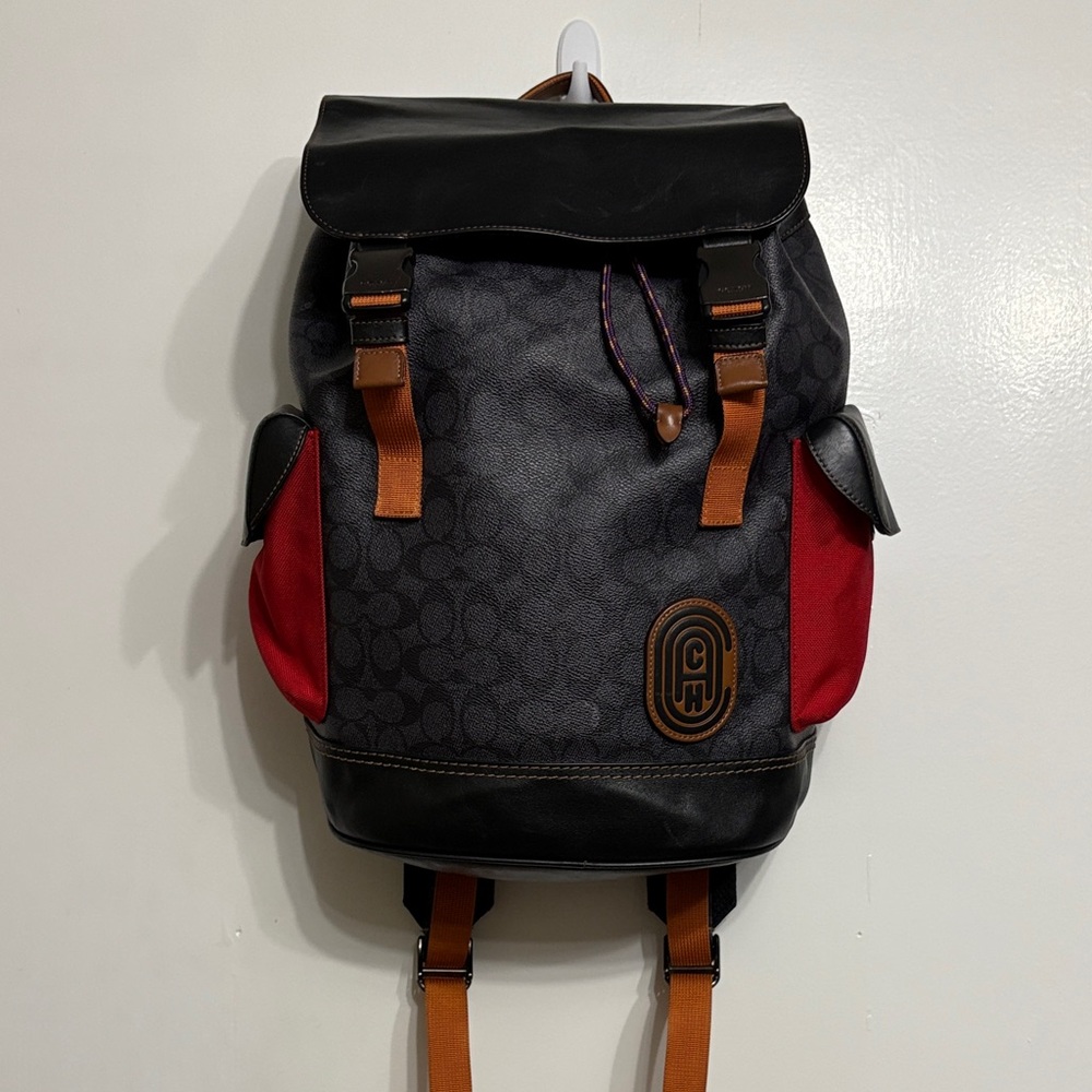 Gently used high end coach backpack originally $595. Signature coated canvas and refined calf leather with inside zip, cell phone and multifunction pockets. Inside sleeve with secure tab for a 15" laptop. Drawstring and speedclip closures, fabric lining. Adjustable shoulder straps 10 3/4" (L) x 15 3/4" (H) x 6" (W). Great used condition with no stains, just small scratches on the hardware - see pics. Clean inside too!