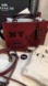 Elegant Coach satchel in deep red. Features bold embroidered patches. Ideal for a chic look.