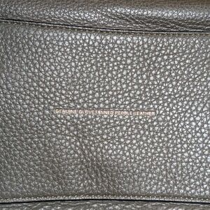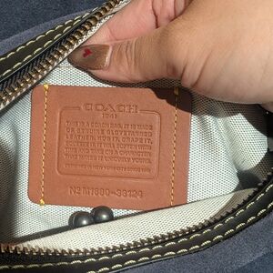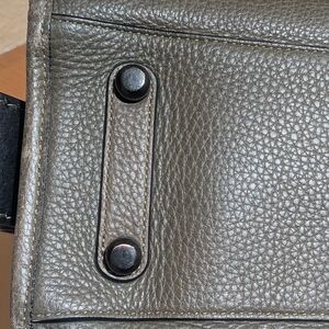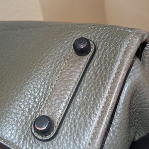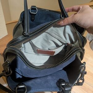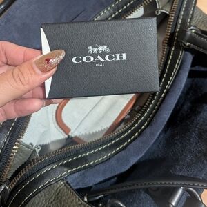 Elegant Coach satchel with olive pebbled leather. Black handles and accents with blue suede interior. Ideal for stylish outings.
