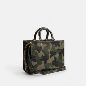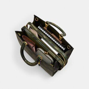 Digitally printed smooth leather One credit card slot Inside snap and multifunction pockets Zip closure fabric and suede lining Two open compartments Handles with 3 1/2 drop Detachable straps with 10 drop for shoulder wear Detachable strap with 21 1/2 drop for shoulder or crossbody wear Four protective feet at base 12 1/4 (L) x 9 3/4 (H) x 6 (W) Style No. CZ498