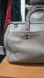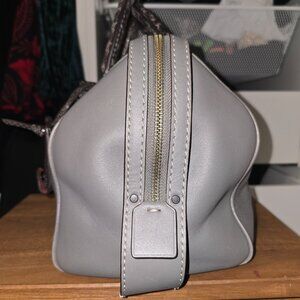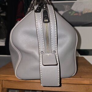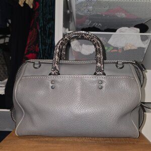 Elegant gray leather handbag featuring stylish snake print handles. Perfect for any occasion.