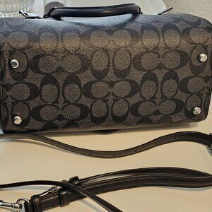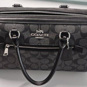 Coach Rowan Satchel in Signature Canvas (Silver/Graphite/Black). Smooth black leather adjustable strap and accents; Silver Hardware; Double handles w/4.25" drop; Detachable crossbody/shoulder strap with 23" drop; Bottom has four (4) silver feet; Zip top closure; Outside zip pocket; Inside fabric lining has zip pocket and one long slip pocket. Smoke-free/Pet-free home. Condition: Very good; used only a few times. Slight blemish on back (2 small white spots; see pictures 3 and 4).