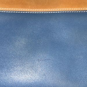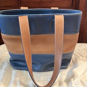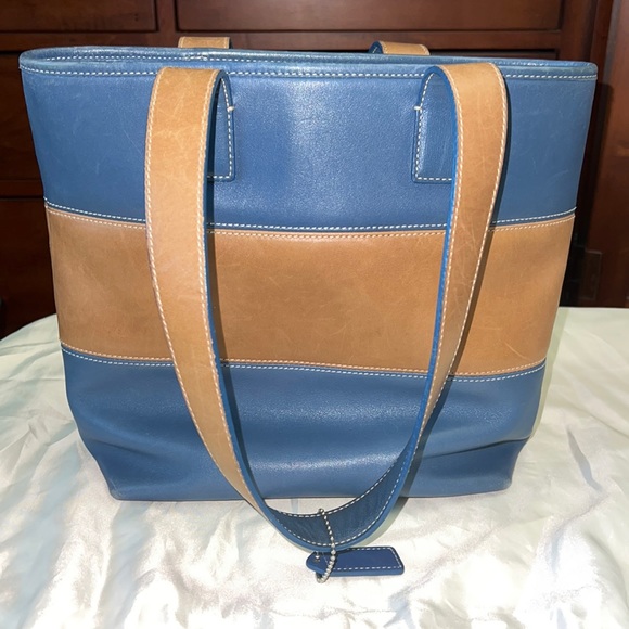 Cute size Coach Rugby tote in blue and tan, some visible use, small pen mark in front.