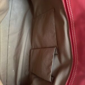 Fully lined in rust colored fabric Silver hardware/buckles Approximately: 16 in (length) x 10 in (height) 7 in handle drop