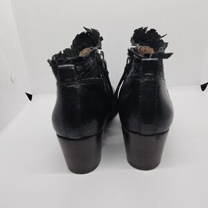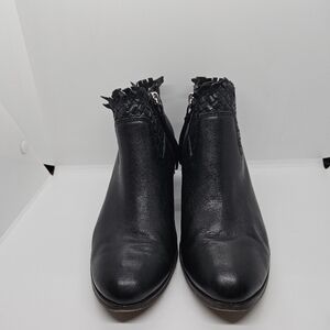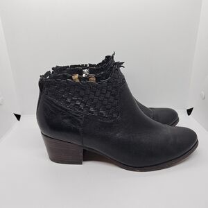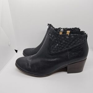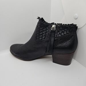 Black leather ankle boots with unique woven detail around the ankle. Fringed finish at the top of the woven portion. Stacked heel. Leather soles. Soles show some signs of wear, which is unavoidable with leather-soled shoes. Uppers are in great shape. Heel measures approximately 2"