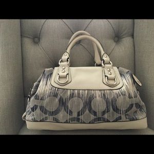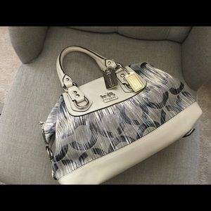 13w x 8h x 5d Navy and Ivory bag with silver accents. Baby blue interior. NWT. Perfect condition. Beautiful bag that will go with many outfits! 🌺💕