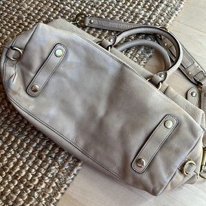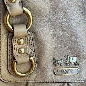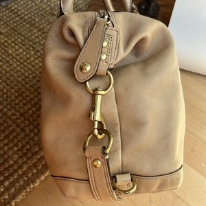 Loads of beautiful gold toned hardware on this compact yet roomy tan satchel. This is the small version at 12”L.