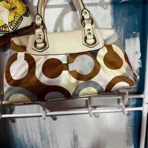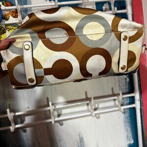 Coach Sabrina OP Art multi color in cream/brown/gray/blue. It is a little dirty and the tag on the inside is cracked. Extra shoulder strap inside.