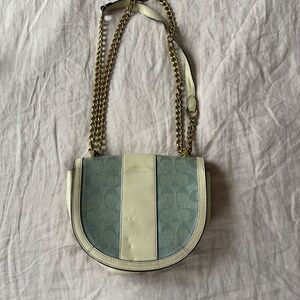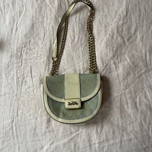 Compact equestrian-style saddle bag crafted from light-washed Signature chambray and refined calf leather in Chalk. Accented with Coach’s iconic Horse and Carriage bar closure and gold-tone hardware.