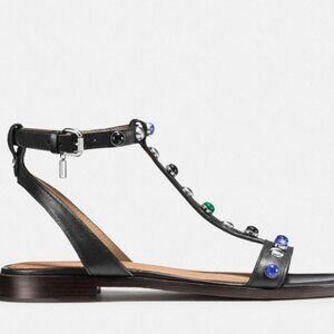 Coach Sadie Semi Matte Calf T-Strap Sandal | Black Leather Upper with Hangtag Charm | Style Q8973 | NIB