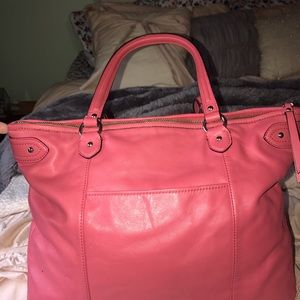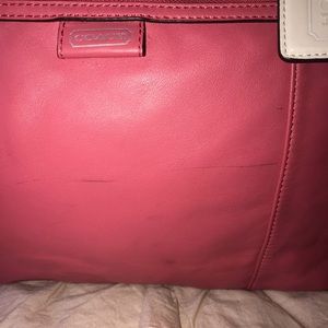 Coach salmon colored handbag satchel. Front of bag has a few marks, interior fabric has a few marks, bag shows signs of use but has plenty of life left for its new home. Features two interior slip pockets and in zip pocket, and exterior zip closure. Measures approx 15x11x5. Please verify condition in photos, bag is priced according to defects.