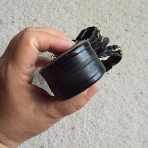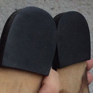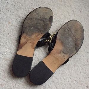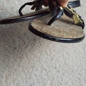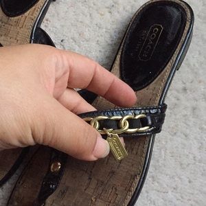 Super cute coach cork in sole sandals, with gold tone links. I posted most of the flaws as best I can. I wore these probably 1 or 2 times. I don't know why the bottom looked that way, but can't tell at all when wearing them , but as for the heal part you can see it doesn't look worn at all.