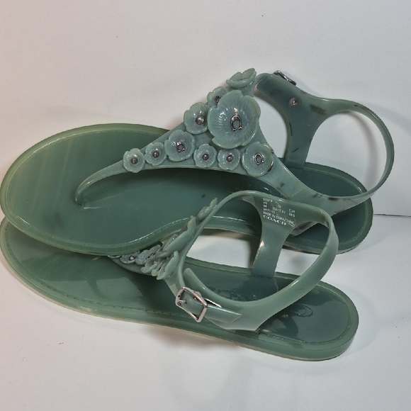 Step into style with these elegant green sandals featuring a charming floral design. Perfect for any casual outing. Natural color changes shown in pictures. See all pictures.