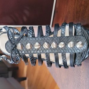 Coach Sarafina Charcoal snake skin leather platform heels with silver studs and bow tie decor. 4.75 inch heel.