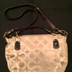 Gold hard wear, leather straps, in great condition. There are a few scratches on the hard wear. It's a very spacious bag!