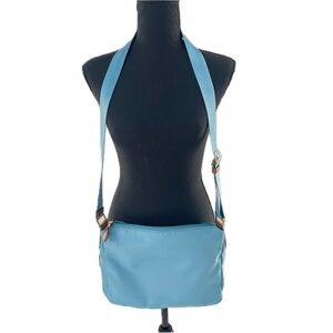 Coach Sawyer Canvas & Tan Leather Crossbody Messenger Bag in Blue Jay, Adjustable Web Strap, Front Zipper Pocket.