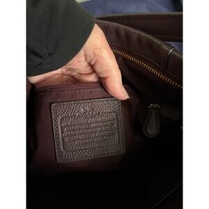 From my personal collection, has some wearing on bottom at corners, very clean. Polished pebble leather, inside zip, cell phone and multifunction pockets, zip-top closure, fabric lining, handle with 9" drop, shoulder strap max 20" drop, adjustable to 13" drop, outside zip pockets, 13" (L) x 9 3/4" (H) x 3 1/4" (W), Color is a brown with purple undertones, Oxblood. Dust bag included.
