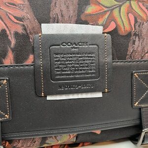 Description from Coach website: "This hands-free design has a front flap with zip pocket and four exterior pockets for organizing essentials. Crafted of durable canvas, it’s printed with our dark oak leaf pattern, a playful take on traditional camouflage prints."