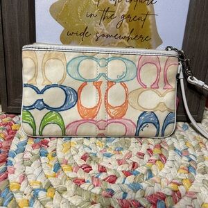 This Coach wristlet features the multicolor design of the Hampton Scribble C collection. Very good condition for being Y2K