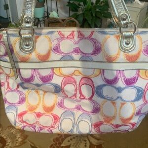 Stylish tote featuring Coach's signature pattern. Includes silver handles and a vibrant multicolor design.