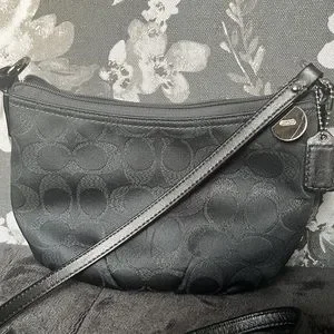 Coach crossbody and wallet set. Graphite exterior/purple interior. Normal signs of wear on the purse, a little more on the wallet (see photos). Strap is not adjustable.
