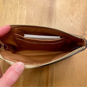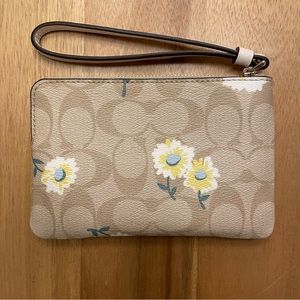 Matching Coach wristlet in Signature Canvas with Daisy Print! Cream colored wrist strap with interior brown lining and two credit card slots. Full zip closure.