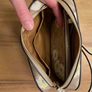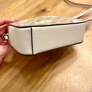Coach Mini Camera Bag in Signature Canvas with Daisy Print! Printed coated canvas and smooth leather with two credit card slots. Inside multifunction pocket with zip closure, fabric lining outside open pocket.