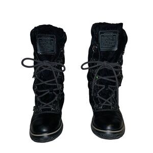 Constructed with a nylon upper and fleece lining material, these boots are warm and cozy. Despite being pre-owned, they are in good condition and have been well taken care of. There is some slight toe scuffing. They are a size 6 and come in classic black, making them a versatile addition to any winter wardrobe.