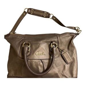 Elegant Coach bag with a shimmering finish. Features sturdy handles and a detachable strap. Ideal for any occasion. Some natural wear.