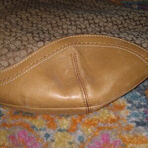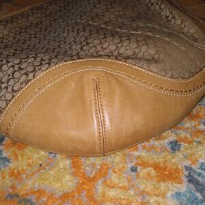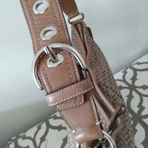 L0720-F10923. This bag is in overall very good condition. Tan and khaki signature jacquard, tan leather, tan grosgrain lining, silver tone hardware, hang tag. Unzips to single compartment, one inner zip lining pocket, two (divided) slip pockets, D-ring. No dust bag.