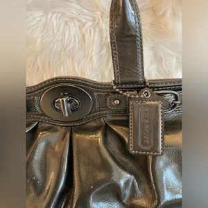 This metallic grey patten-leather authentic Coach shoulder bag is in excellent condition.