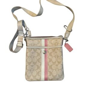 This Coach crossbody bag showcases a sophisticated blend of tan and pink hues, embodying the brand's iconic style.