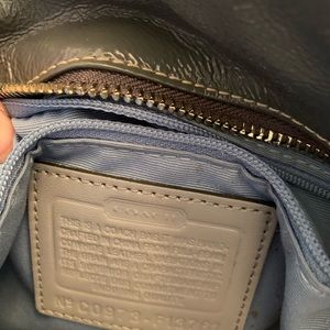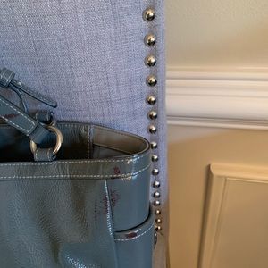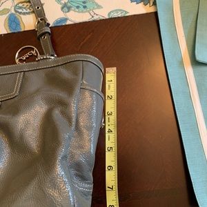 Gray patent shoulder handbag; does have some stains as pictured
