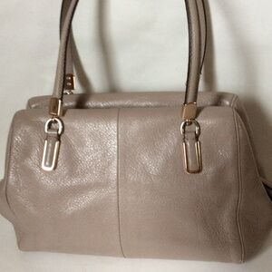 Coach Shoulder Satchel Taupe Bag with gold hardware accents and a gray exterior color. It comes with a turn lock and a zip closure that keeps your belongings safe and secure, while the gray leather strap ensures comfortable carrying. Bag Charm, Clochette. The medium-sized bag has a satin purple lining, adding a touch of luxury to the overall design.