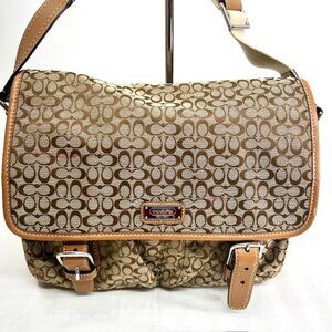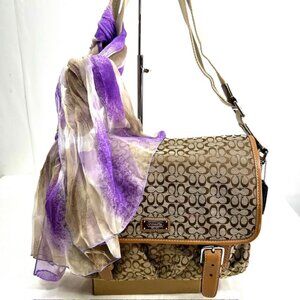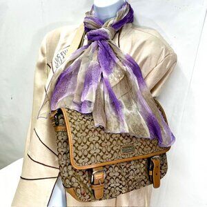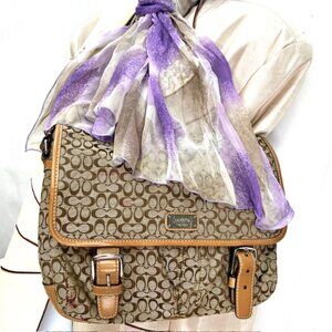 # 28. Vintage Coach ShoulderCrossbody Working Bag both for men or women Made with a beige logo canvas exterior and large size 14" x10" x4" with a rectangular shape, this bag offers a convenient shoulder crossbody style with an adjustable strap for added comfort. The bag includes button and clasp closures, inner pockets, and a matte finish, making it perfect for various occasions such as travel, casual outings, workwear, and business meetings. Additionally, the bag comes with a FREE sheer polyester unbrand scarf 58" x 20" purple brown as a bonus at cost to buyer