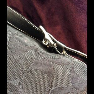 Signature Coach Backpack. Black leather straps with white topstitch. 10" x 12 1/2". Plenty of room on the inside. One inside zipped pocket. Zipped pouch in the front. Small flaw on the front shown in the third picture. Reduced by $5 on 11/28, 12/20, 2/19, 3/28. FINAL REDUCTION, PRICE IS FIRM