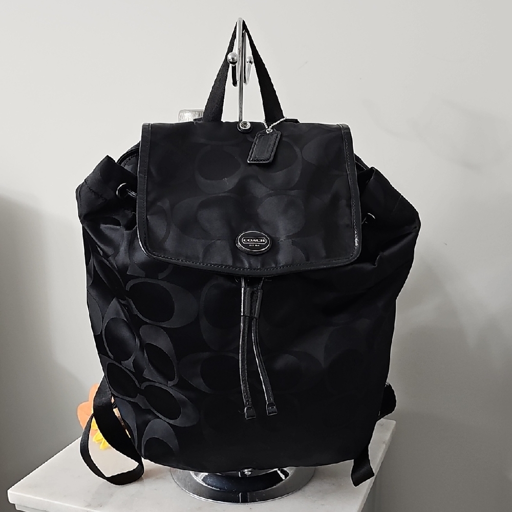 Black, nylon Coach Packable Backpack with snap & drawstring closure. Adjustable straps & interior zip pocket, 2 slip pockets. Black signature C design.