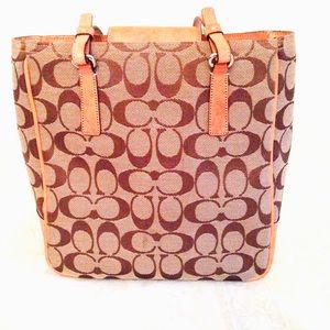 Authentic Coach Signature Tote/Shoulder Bag with the classic Coach pattern. Shoulder straps and bag trim all made of leather. (Excellent condition carried twice). 9x9x3 1/2. 10in(drop) double leather shoulder straps. Magnetic snap closure. Inside zippered pocket.