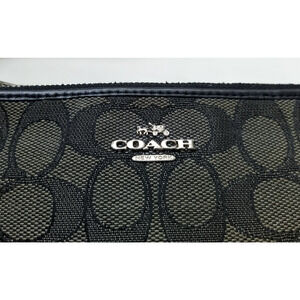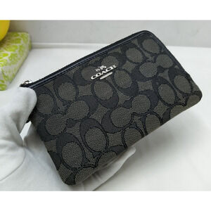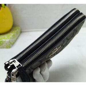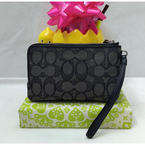 Coach Signature Black Canvas Leather Double Zipper Credit Card Wristlet Wallet