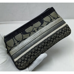 Coach Signature Black Canvas Leather Trim Stripe Zipper Wrislet - Coin Wallet