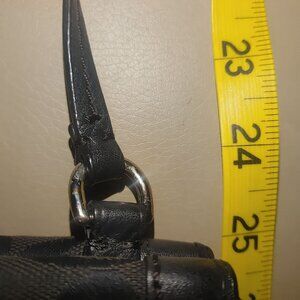 Minor wear on leather trim. Measurements: Width = 6.5 inches, Height = 4.5 inches, Strap drop = 24 inches.