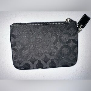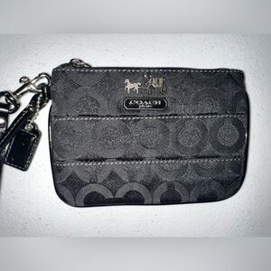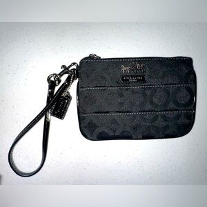 Elegant black wristlet with iconic Monogram Coach pattern. Includes a sleek wrist strap.
