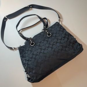 This is a great size coach handbag. Satiny finish fabric with embroidered C’s. Gently used good condition. Only noticeable flaw is in the patent leather. It has signs of wear/crinkles (see photos) but no tears or rips. Three interior sections. Middle is a zip close. Sides snap shut to the middle section with magnetic snaps as shown in picture. Interior is in very good condition, black satin finish fabric. Silver hardware. Longer handle can be removed. Make an offer!